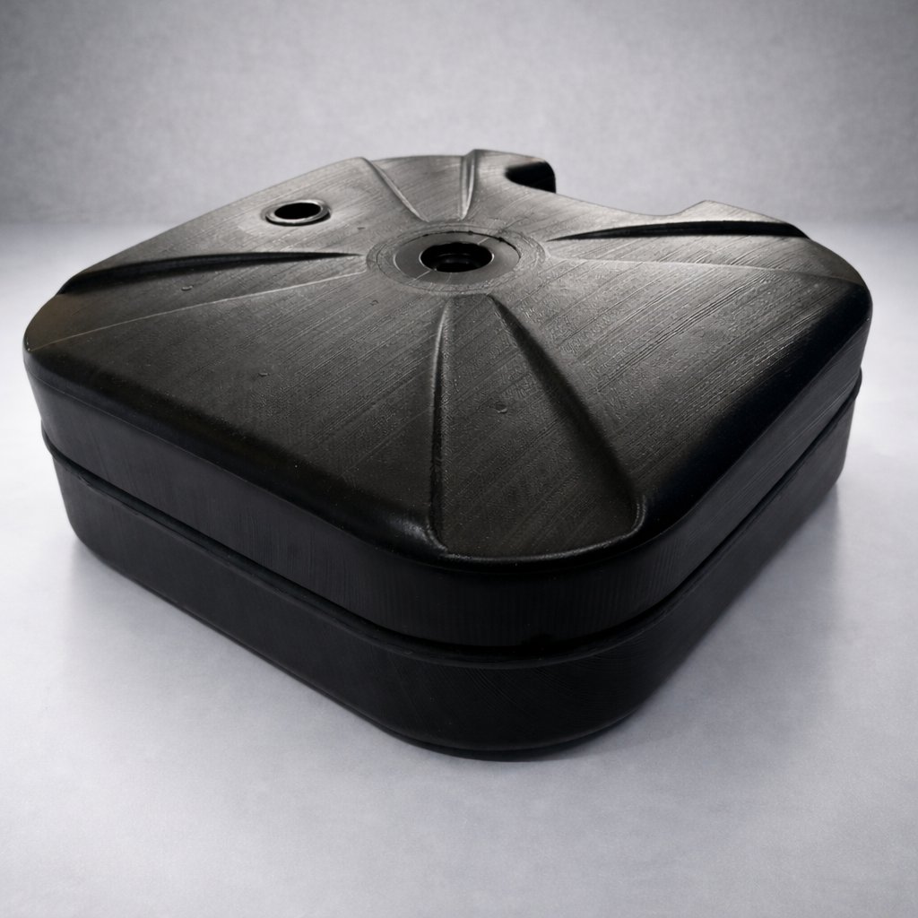 Fabricada em polietileno de alta resistência, essa base possui compartimento interno para preenchimento com água ou areia, proporcionando peso adicional e excelente fixação para bandeiras promocionais mesmo em áreas com vento moderado.